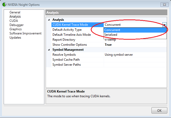 On NVIDIA graphics cards build on the Fermi architecture, the new concurrent trace mode is enabled by default. A user may override that default behavior by changing the analysis setting of the NVIDIA Nsight options. On NVIDIA GPUs built on the Tesla architecture, the serialized capture mode is always used, regardless of the configuration specified in the NVIDIA Nsight options.