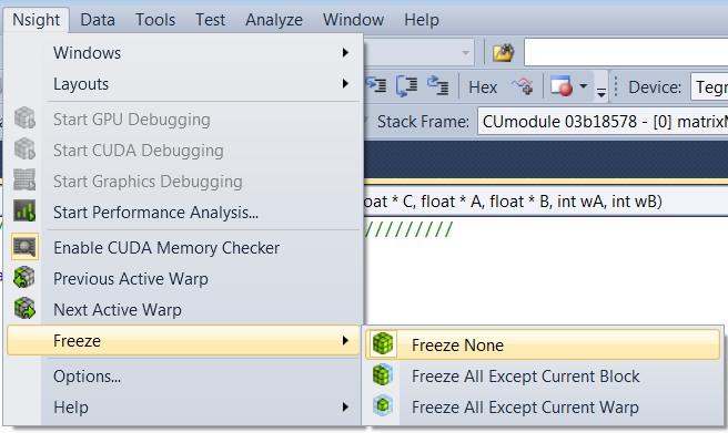 The NVIDIA Nsight main menu has a global freeze option. This allows the user to control which warps will make progress when using any CUDA run control (such as stepping, resume, or run to cursor). For example, the user is able to ensure that only one warp moves when stepping.